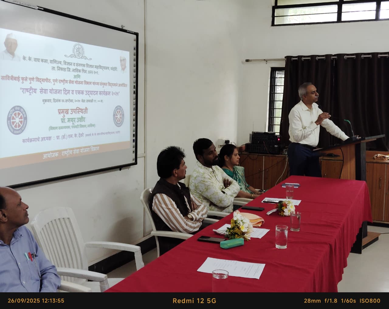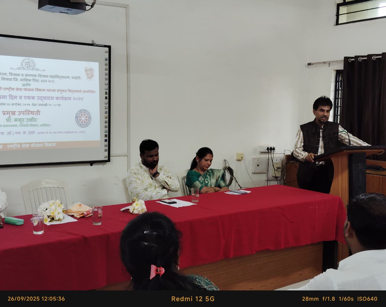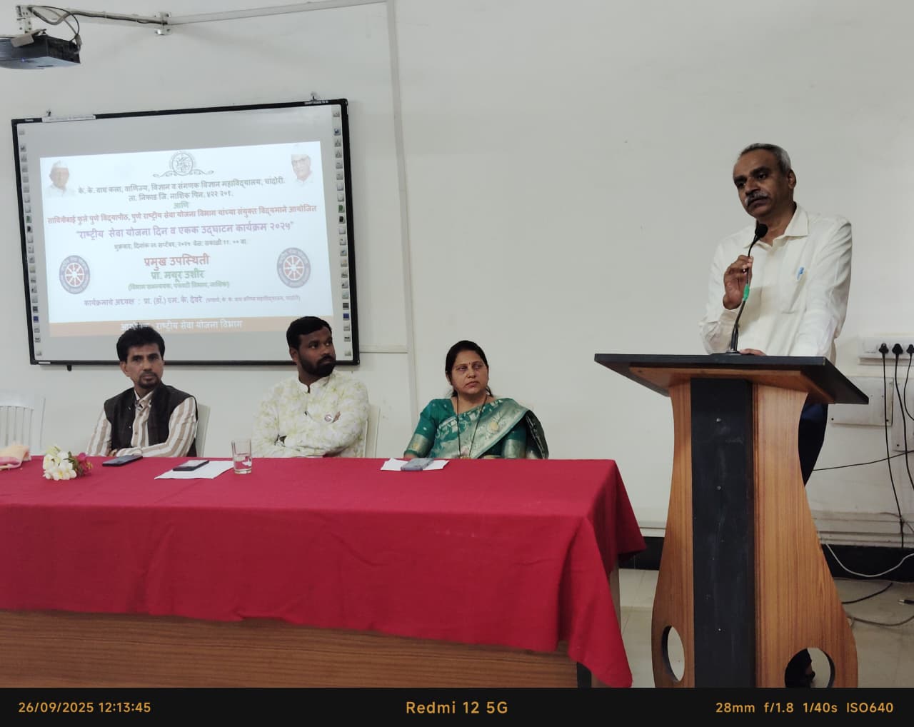 All Photos-"राष्ट्रीय सेवा योजना दिन व एकक उद्घाटन कार्यक्रम २०२५" प्रमुख उपस्थिती : प्रा. मयूर उशीर (विभाग समन्वयक, पंचवटी विभाग, नाशिक) कार्यक्रमाचे अध्यक्ष : प्रा. (डॉ.) एम. के. देवरे (प्राचार्य, के. के. वाघ वरिष्ठ महाविद्यालय, चांदोरी)